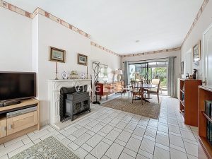 - 1er étage : un spacieux living en L agrémenté d’un poêle à bois, une cuisine équipée, et une lumineuse véranda donnant accès au jardin de plain-pied.