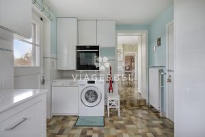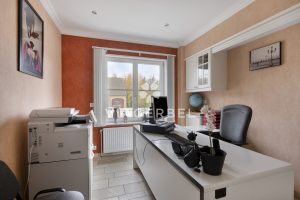 - Rez-de-chaussée : hall d’entrée central, vaste séjour traversant avec cheminée, salle à manger attenante, cuisine séparée avec accès direct à la buanderie. Bureau indépendant en façade avant. Garage intégré avec accès intérieur. Circulation fluide entre les espaces de vie et les pièces de service.